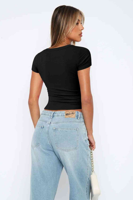 Half Button Scoop Neck Short Sleeve Knit Top